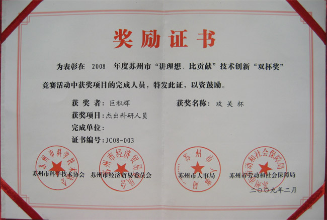 等級:市級|獲得者:巨積輝|獲獎年份:2008年所獲榮譽